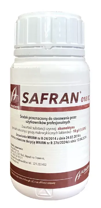 Safran 018 EC to środek owadobójczy i przędziorkobójczy przeznaczony do stosowania w szklarniach o trwałej, odizolowanej od podłoża konstrukcji. Zawiera abamektynę w stężeniu 18 g/l.