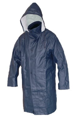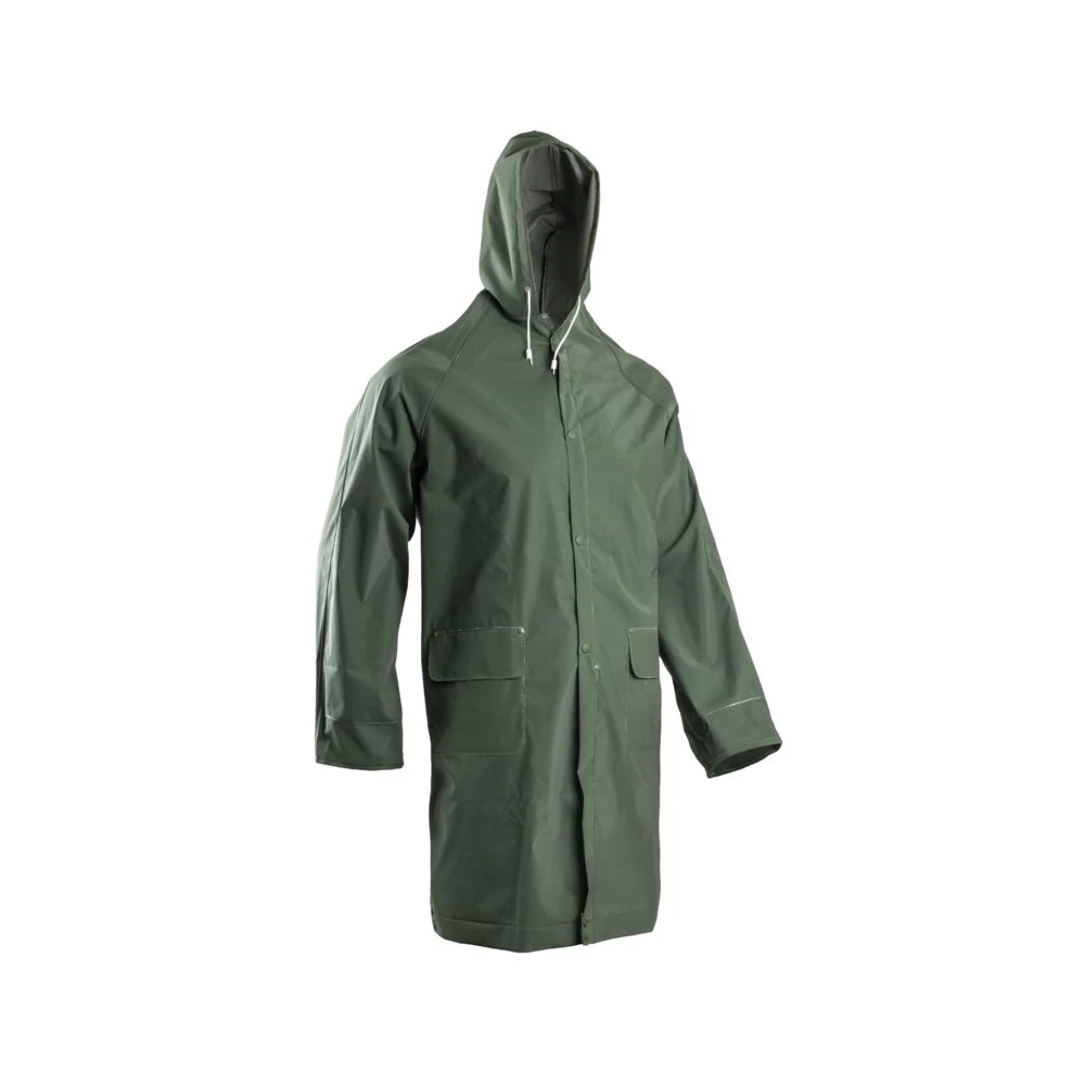 Płaszcz przeciwdeszczowy wykonany z wysokiej jakości PVC oraz poliestru, zapewniających wytrzymałość, lekkość oraz odporność na wilgoć. Zgodny z normą EN ISO 13688, należy do pierwszej kategorii środków ochrony indywidualnej (CE), zapewniając podstawową ochronę przed czynnikami zewnętrznymi niskiego ryzyka.