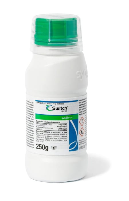 Switch 62,5 WG zwalcza choroby takie jak: alternarioza cebuli, alternarioza naci, antraknoza (opadzina) liści porzeczki, antraknoza dyniowatych, antraknoza orzecha włoskiego, askochytoza, brunatna zgnilizna, brunatna zgnilizna drzew pestkowych, gorzka zgnilizna, mokra zgnilizna, mączniak prawdziwy, nekroza kory winorośli, purpurowa plamistość pędów, rdza brunatna, rdza brunatna pszenicy, rdza jęczmienia, rdza karłowa jęczmienia, rdza malin, rdza pora, rdza wejmutkowo-porzeczkowa, rdza źdźbłowa zbóż i traw, rdza żółta, szara pleśń, zamieranie pędów, zgnilizna szyjki cebuli, zgnilizna twardzikowa, zgorzelowa plamistość |