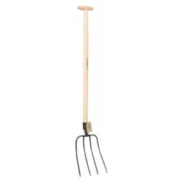 Widły 4-zębne wykonane z metalu wyposażone w drewniany trzon z zakończeniem w kształcie litery T